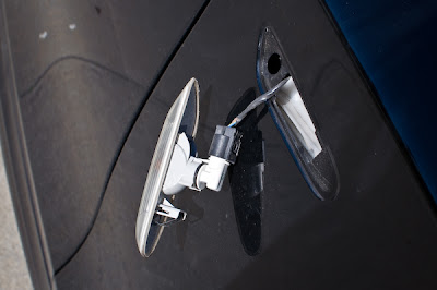 BMW的葉子板上的側燈設計,都是用一個簧片在前面頂住固定,所以往前推就可以把側燈推出來了!